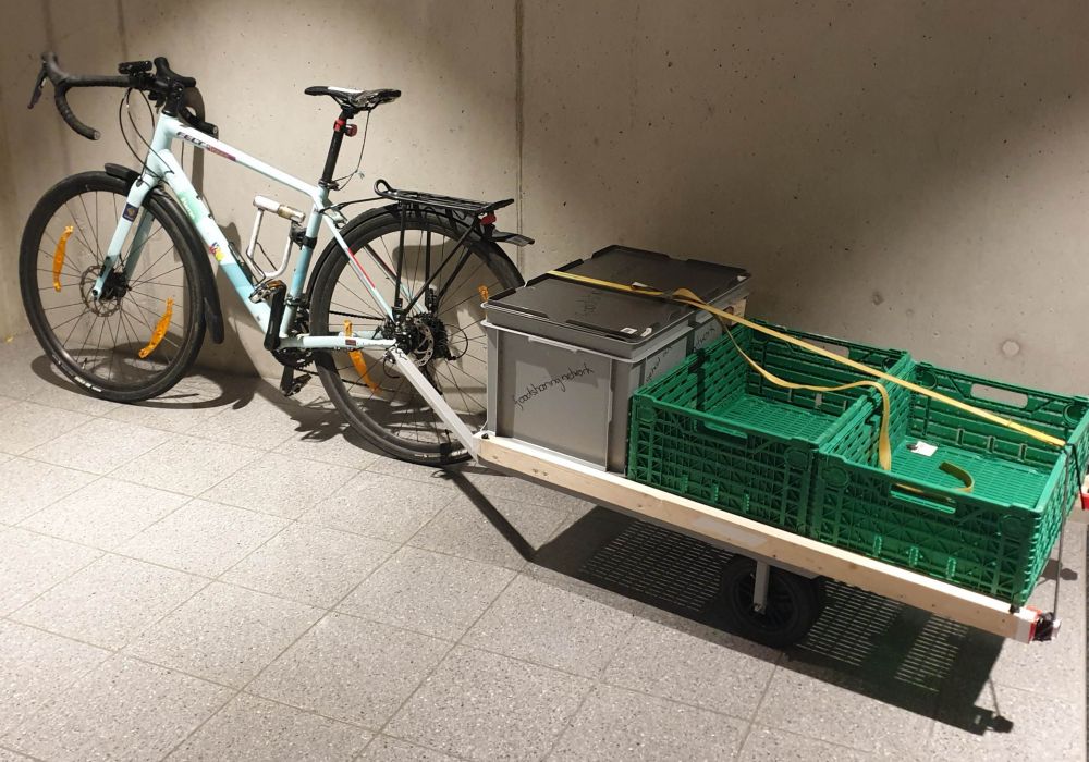 - Ladefläche 60 cm x 120 cm (für bis zu drei 40 cm x 80 cm Kisten). Die grünen Kisten werden falls benötigt mit ausgeliehen.