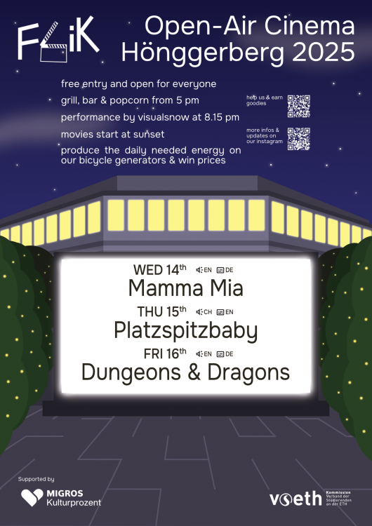 Vom 14. bis 16. Mai verwandelt sich der Hönggerberg in ein grosses Freiluft-Kino! Der Eintritt ist frei und alle sind herzlich willkommen!