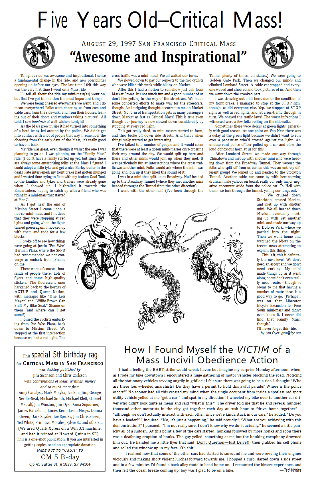 In einem Zine von 1997 anlässlich der 5-jährigen Durchführung der Critical Mass in San Francisco findet sich auf Seite 8 die erste Dokumentierung, dass es in Zürich eine Critical Mass gibt.