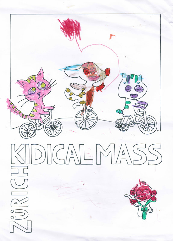 Bei der Kidical Mass im August haben wir eine Ausmalvorlage für den nächsten Flyer an die Kinder verteilt. Wir haben fünf wunderschöne Einsendungen erhalten – den Flyer der siebenjährigen Filomena haben wir gleich für die kommende Kidical Mass vom 26. September gedruckt.