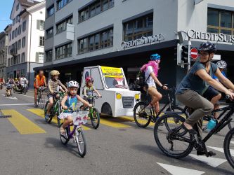 Der Umzug verlief genauso friedlich wie auf den Quartierstrassen, die wir bisher benutzt hatten, und auch vielen Autofahrer*innen war die Freude an den vorbeiradelnden Kids sichtlich anzusehen.