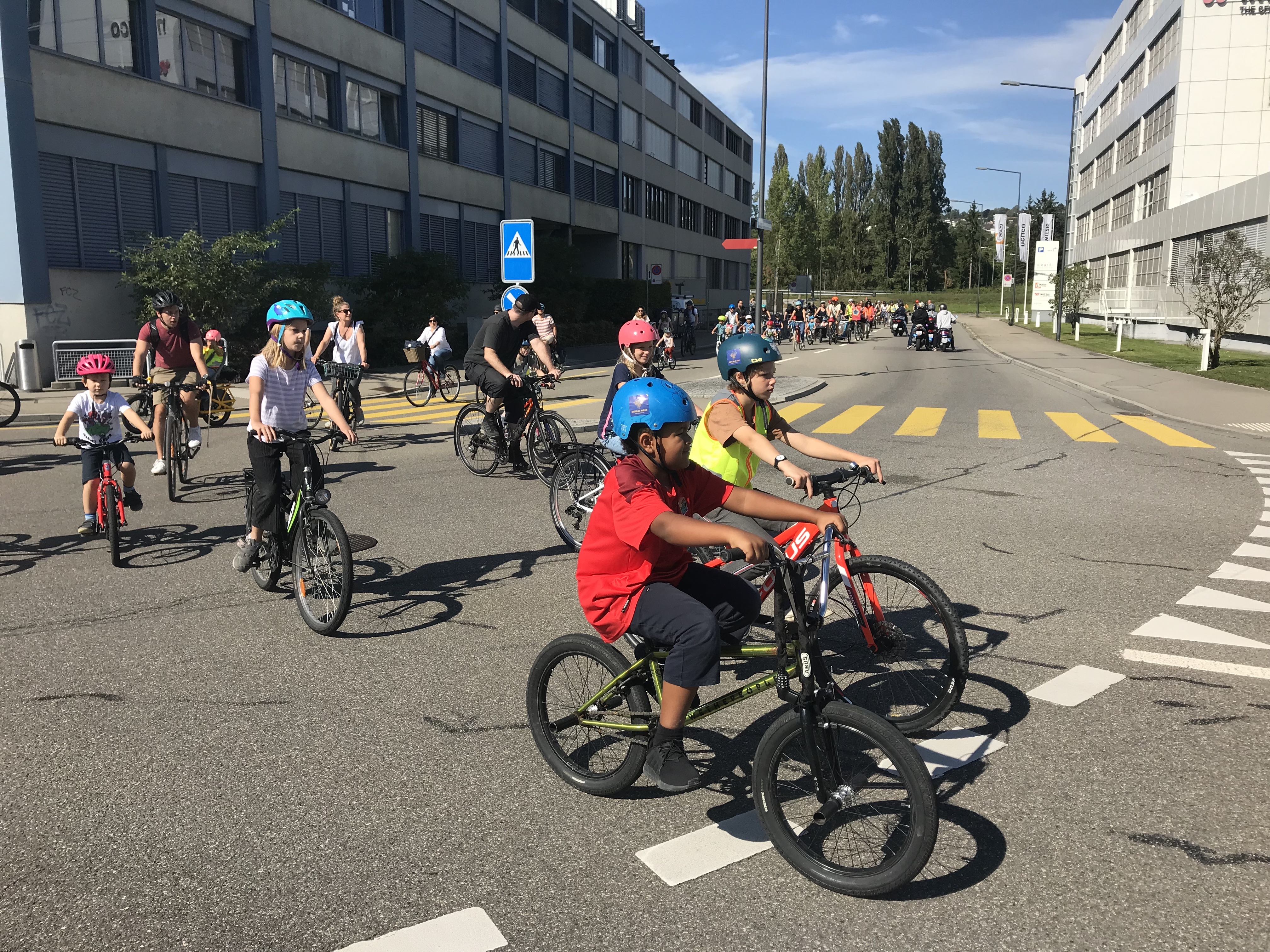 - Am 18. September, am Tag der weltweiten Kidical Mass, fuhren die Kids vom GZ Bachwiesen über die Pfingstweidstrasse zum GZ Schindlergut.