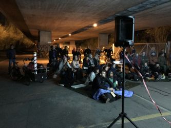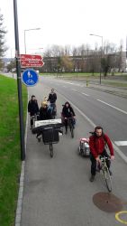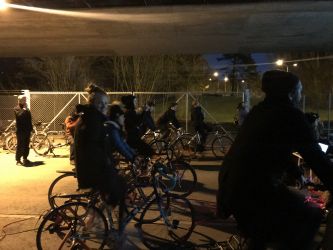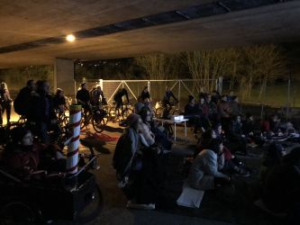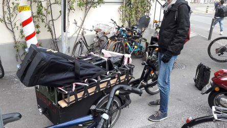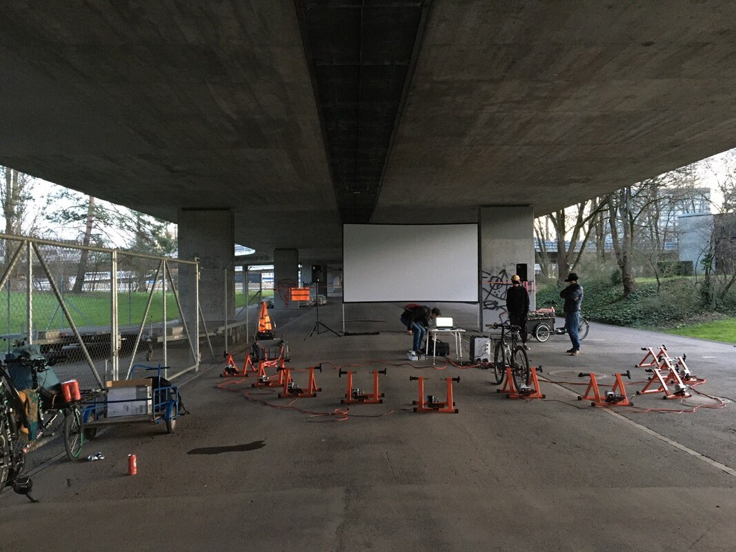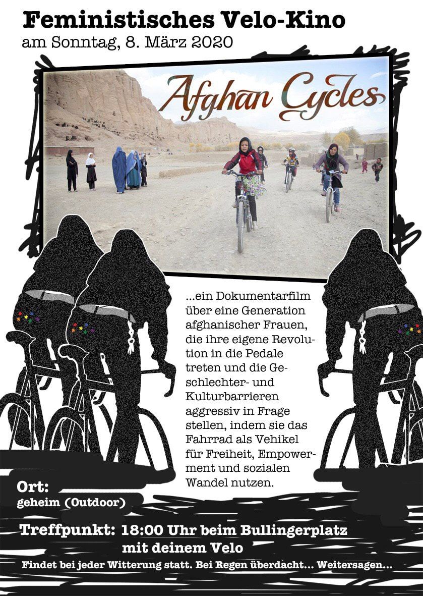 Der Verein Vélorution solidarisierte mit dem feministischen Streik und veranstaltete ein Guerilla-VeloKino an einem geheimen Ort in Zürich. Eine bunte Gruppe von ca. 30 Velofahrer*innen traf sich um 18h am Bullingerplatz und fuhr gemeinsam zum Openair-Kino. Geschaut wurde der Film Afghan Cycles, der zeigt, welche Rolle das Velo in der Emanzipation der Frauen* spielen kann. Hier geht es zum Trailer.